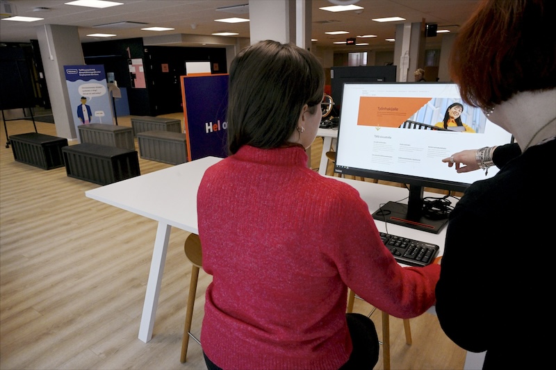 LKS 20250520 LKS 20250424 Asiakasta neuvotaan työnhaussa Helsingin työllisyyspalveiden toimipisteessä 17. helmikuuta 2025. Vuoden 2025 alusta lähtien TE-palveluiden järjestämisvastuu siirtyi valtiolta kunnille., LEHTIKUVA / MARKKU ULANDER